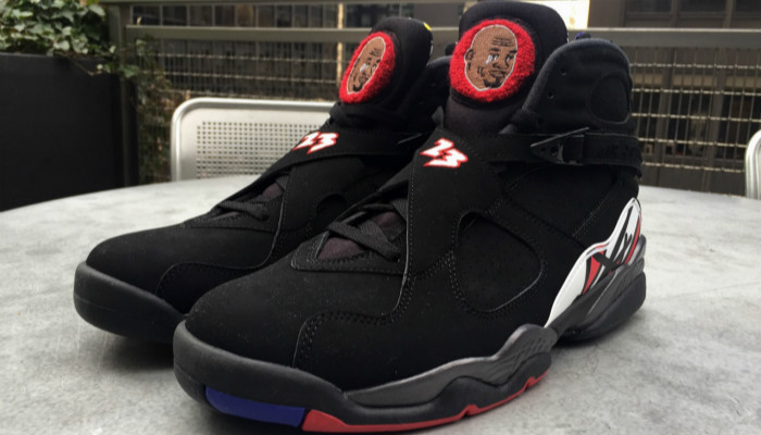 在这款Air Jordan 8 “季后赛”配色中,乔丹本人的哭泣脸被加到了鞋舌上,取代了原有的“飞人”标志;此外,它还被加到了鞋垫之上。本身配色就已经比较花哨的这双Air Jordan 8在加上哭泣脸之后更加引人注目。