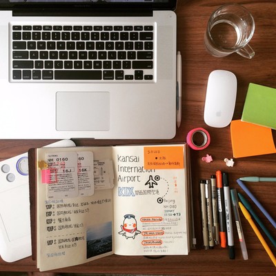 记录的时候,往往会使用贴纸、和纸胶带或者是简笔画进行装饰,让版面看起来更赏心悦目。照片、名片、车票、收据…. 一切你想要记录留住的事物,都可以贴到手账里,这些美好事物就变成你手账里可以随时回忆的一页。
