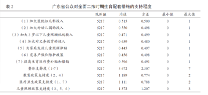 2016年全面二孩政策实施后,中山大学中国公共管理研究中心在广东省21个地级市开展了一项抽样调查,研究公众对二孩生育配套政策的态度。研究者提供了政府报告和媒体报道中出现的7 类配套措施选项,包括:(1)加大医院妇产科和儿科建设投入;(2)加大对幼儿园的投入;(3)加大对三岁以下儿童照顾机构的投入;(4)加大对义务教育的投入;(5)为家庭发放儿童照顾津贴;(6)完善产假和陪护政策;(7)提高生育医疗费的补贴标准和报销。