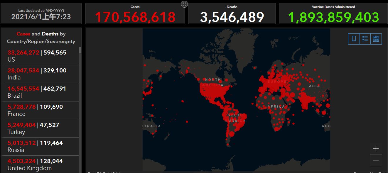 据约翰斯·霍普金斯大学的疫情追踪数据,截至北京时间6月1日上午8点,全球累计确诊新冠肺炎病例170568618例,累计死亡3546489例。