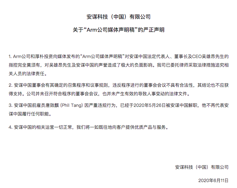 但2020年6月10日,ARM发媒体声明稿,表示联合大股东厚朴投资,以危害公司利益为名,罢免吴雄昂安谋中国CEO一职。次日,ARM中国发声明表示ARM的指控莫须有,罢免程序不具合法性,吴雄昂继续担任CEO一职领导公司。上演了一出换帅闹剧。