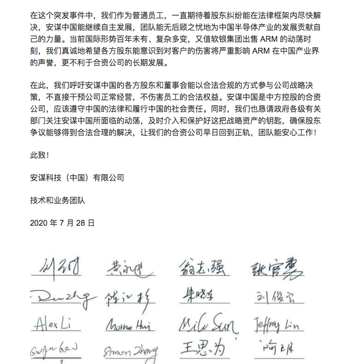 7月28日,ARM中国还在官方公众号发布了一则附有公司员工签名的联名信,力挺吴雄昂。