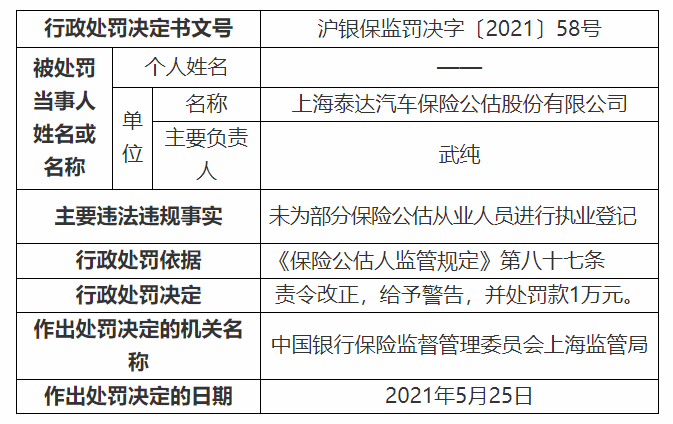 未为部分保险公估从业人员进行执业登记,上海泰达汽车保险公估股份有限公司被罚