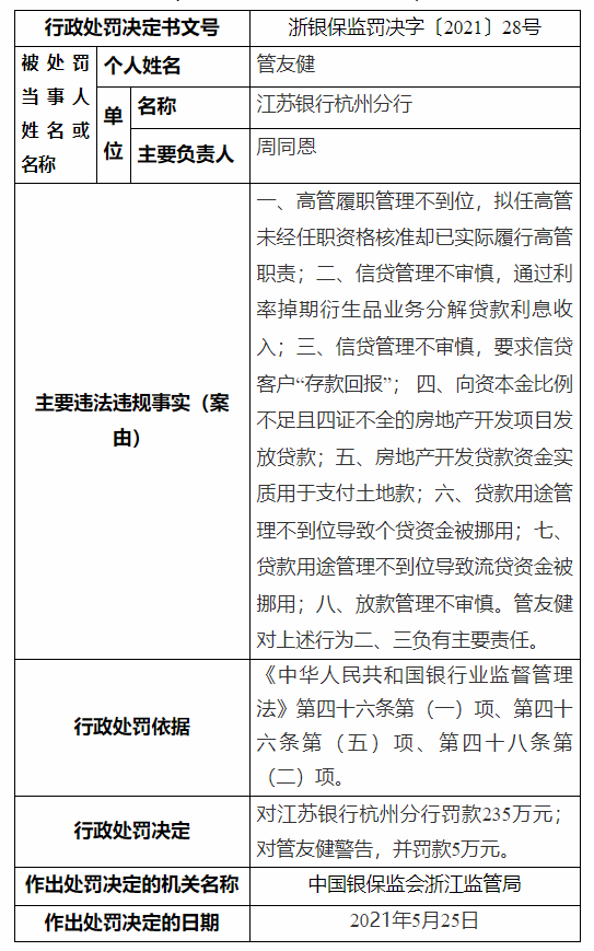 6月1日消息,据中国银保监会浙江监管局行政处罚信息公开表,江苏银行杭州分行存在以下主要违法违规事实:一、高管履职管理不到位,拟任高管未经任职资格核准却已实际履行高管职责;二、信贷管理不审慎,通过利率掉期衍生品业务分解贷款利息收入;三、信贷管理不审慎,要求信贷客户“存款回报”;四、向资本金比例不足且四证不全的房地产开发项目发放贷款;五、房地产开发贷款资金实质用于支付土地款;六、贷款用途管理不到位导致个贷资金被挪用;七、贷款用途管理不到位导致流贷资金被挪用;八、放款管理不审慎。银保监会浙江监管局决定对江苏银行杭州分行罚款235万元。