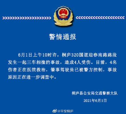 据@平安桐庐 6月1日通报,6月1日上午10时许,桐庐320国道迎春南路路段发生一起三车相撞的事故,造成4人受伤。目前,4名伤者正在医院救治,肇事驾驶员已被警方控制,事故原因正在进一步调查中。
