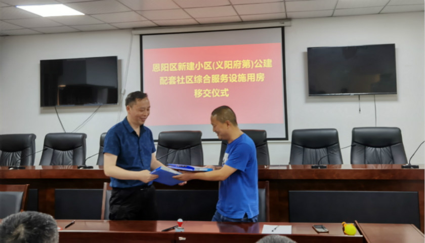 为认真贯彻落实《中共巴中市委 巴中市人民政府关于进一步加强和完善城乡社区治理的实施意见》以及《巴中市新建小区公建配套社区综合服务设施移交管理办法》文件精神,5月31日下午,恩阳区民政局开展我为群众办实事活动,在登科街道麻石社区服务中心举行公建配套社区综合服务设施用房移交仪式,恩阳区住建局、恩阳区自规局、恩阳区房管局、登科街道办事处、麻石社区等单位参加了本次仪式。