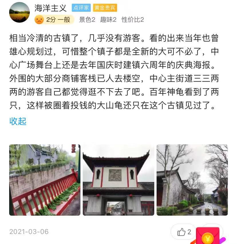 但可以看到的是,桃花源景区提质改造内容集中于规模扩大、景区项目整合、设施优化等基础层面,改造后的景区仍然以溪、谷、山等观光性景观为主。作为改造的“重头戏”,公开信息显示,桃花源古镇总投资超过60亿,打造成一处集餐饮、旅居、娱乐、购物等为一体的综合性古镇。但在古镇风潮兴起的背景下,桃花源古镇并未脱离仿古建筑+商业街区的打造模式,缺少文化积淀, 推出后口碑和热度均不甚理想。