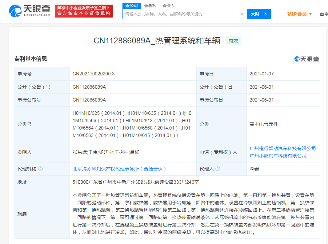 据天眼查APP显示,6月1日,广州小鹏汽车科技有限公司公开一项“热管理系统和车辆”发明专利,公开号为CN112886089A,申请日期为2021年1月7日。