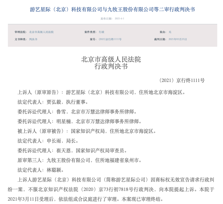 据天眼查APP显示,6月1日,北京法院审判信息网公布游艺星际(北京)科技有限公司与九牧王股份有限公司等二审行政判决书,判决结果为驳回上诉,维持原判。