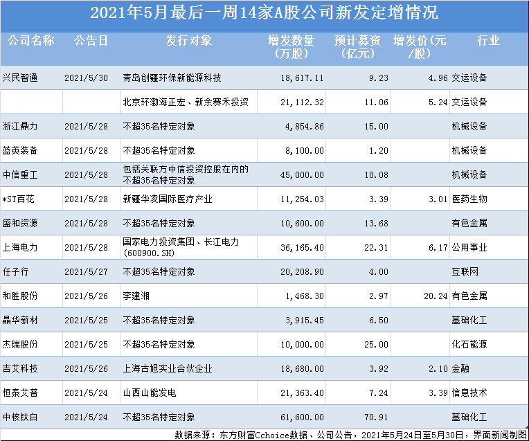 值得一提的是,5月28日晚间,上海电力、浙江鼎力(603338.SH)、盛和资源(600392.SH)、中信重工(601608.SH)、*ST百花(600721.SH)、蓝英装备(300293.SZ)等6家公司披露新的定增方案,用于投建项目或补充流动资金。