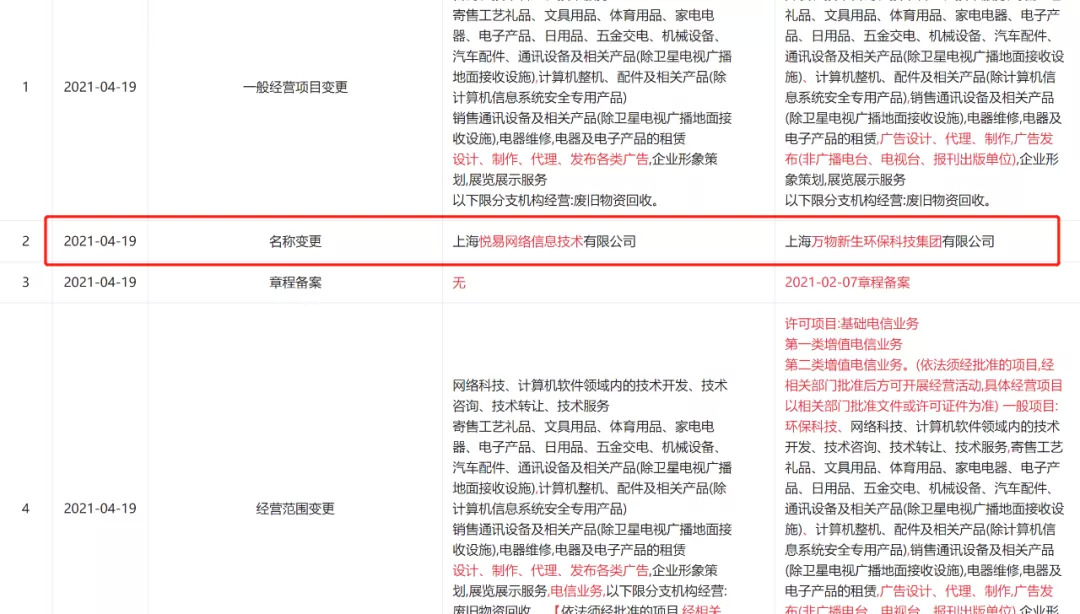 爱回收品牌改名为万物新生后,公司名称也由上海悦易网络信息技术有限公司,更名为上海万物新生环保科技集团有限公司。