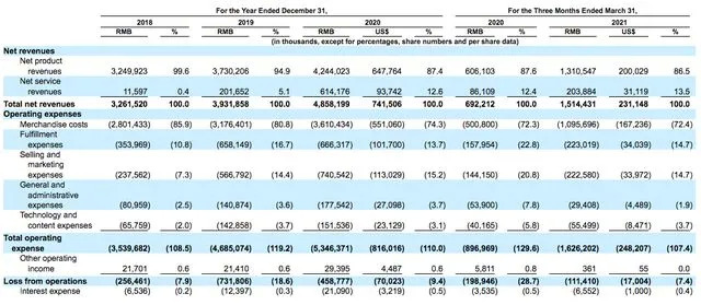 但目前来看,万物新生的现金流并没有陈雪峰所说的那么乐观。招股书数据显示,从2018年至2021年1-3月份,万物新生的经营现金流分别为-3.58亿元、-4.11亿元、-4.13亿元和-3.03亿元。