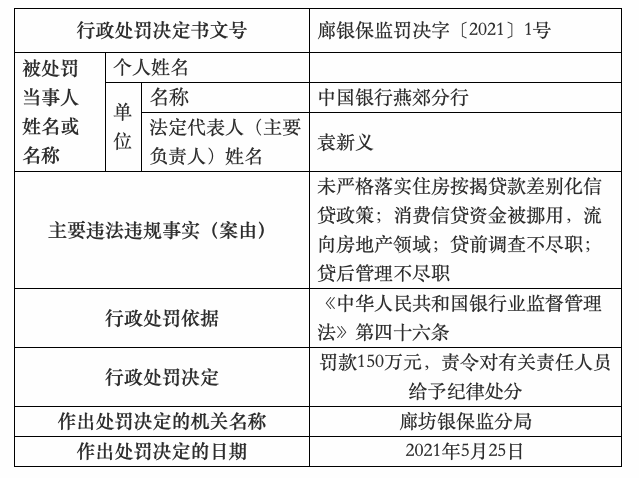 银保监会官网6月1日消息,廊坊银保监分局发布的行政处罚信息公开表显示,中国银行燕郊分行因未严格落实住房按揭贷款差别化信贷政策;消费信贷资金被挪用,流向房地产领域;贷前调查不尽职;贷后管理不尽职等违法违规事实,被廊坊银保监分局罚款150万元,并被责令对有关责任人员给予纪律处分。靳宝申对上述违规行为负有管理责任被给予警告,并处罚款8万元。