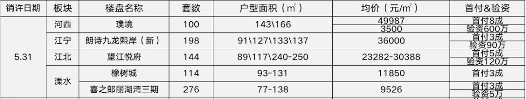此外,根据南京网上房地产官网显示,昨日南京共计5盘成功领取销许,其中最高首付8成、验资600万,均于今天开始报名。