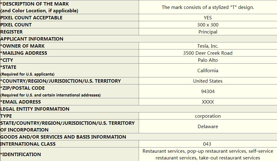 根据特斯拉5月27日向美国专利和商标局(USPTO)提交的文件,该公司申请了三个新商标,将涵盖“餐厅服务、弹出式餐厅服务、自助餐厅服务、外卖餐厅服务”。该申请正在等待审查,并将在8月27日左右由律师审查。