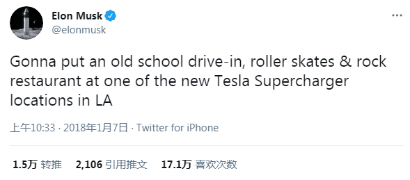 2017年,特斯拉时任首席技术官(CTO)斯特劳贝尔(JB Straubel)曾在一次会议上表示,特斯拉可能会进军餐饮业。之后,马斯克也曾在2018年1月发推说,特斯拉计划在洛杉矶一个新的特斯拉超级充电站开设一家“老式免下车、旱冰鞋和摇滚餐厅”。