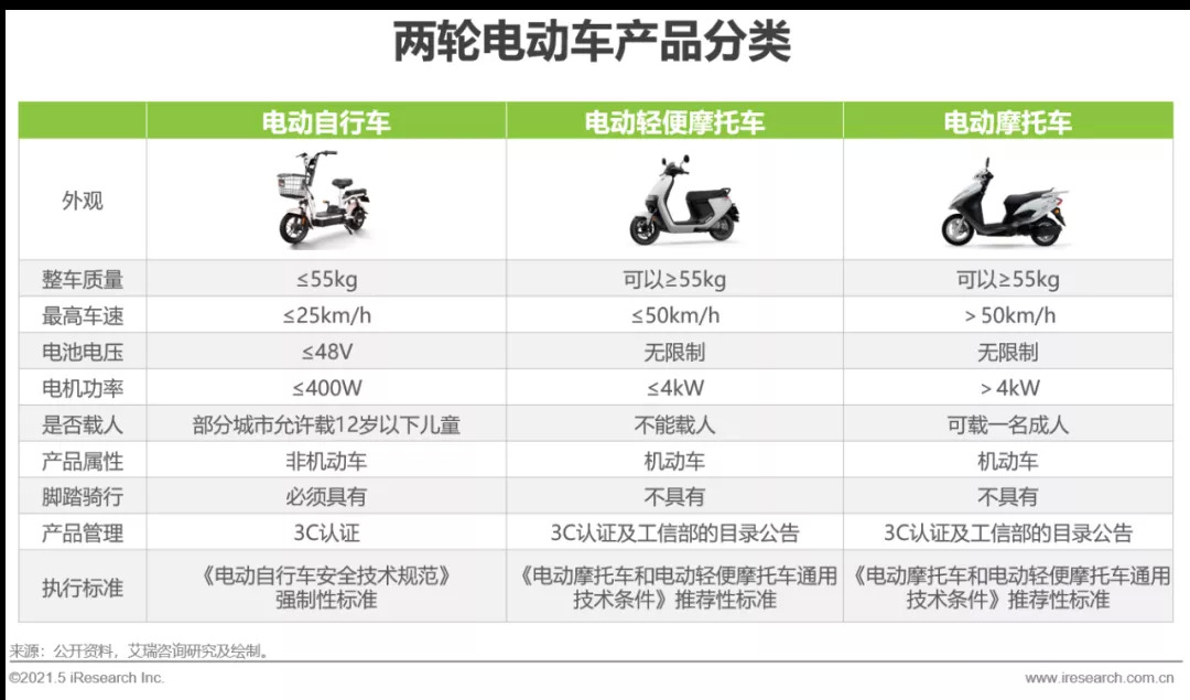《电动自行车安全技术规范》(GB17761-2018)强制性国家标准出台后,长期以来不明确的“电动车”“电动踏板车”被重新定义,根据《新国标》技术规范,两轮电动车可划分为三类:电动自行车、电动轻便摩托车、电动摩托车。电动自行车:又称国标车,要求必须具备脚踏骑行功能,蓄电池作为辅助能源,速度不超过25km/h,属于非机动车。电动轻便摩托车:由电力驱动,电机额定功率总和不大于4KW,最高设计车速不大于 50km/h的摩托车,属于机动车。电动摩托车:由电力驱动,电机额定功率总和大于4KW,最高速度大于50km/h的摩托车,属于机动车。