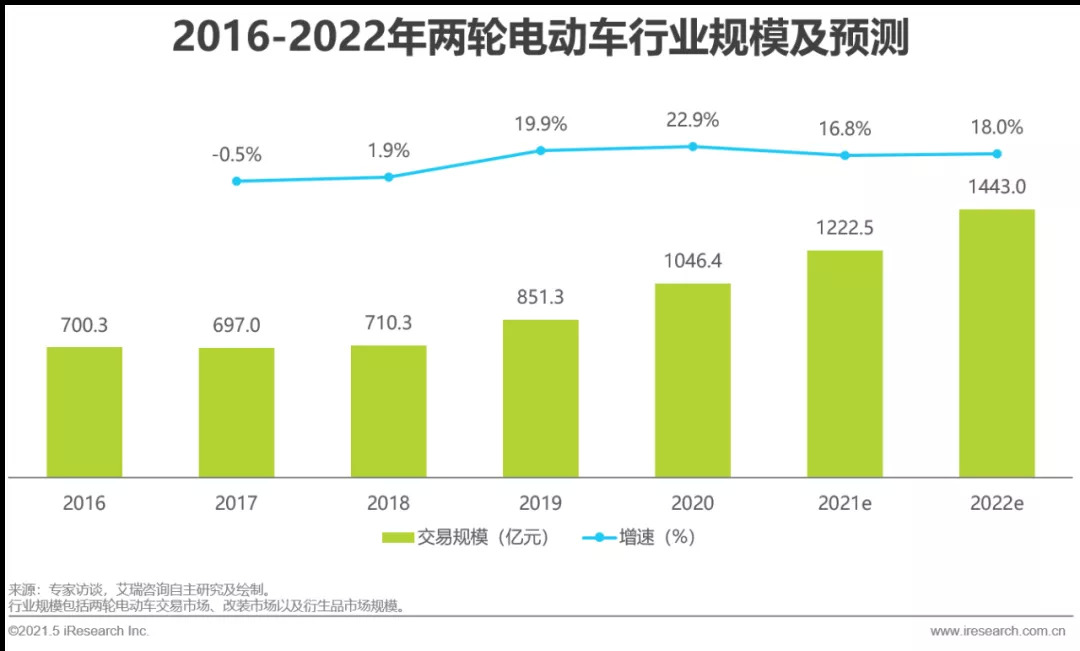 2020年,中国两轮电动车市场规模达1046亿元,2021-2023年两轮电动车的规模增长贡献主要来自新国标替换产生的销量增长。新国标后,低端两轮电动车产品被淘汰,两轮电动车产品平均单价有所提升,预计2022年两轮电动车市场规模可达1443亿元。