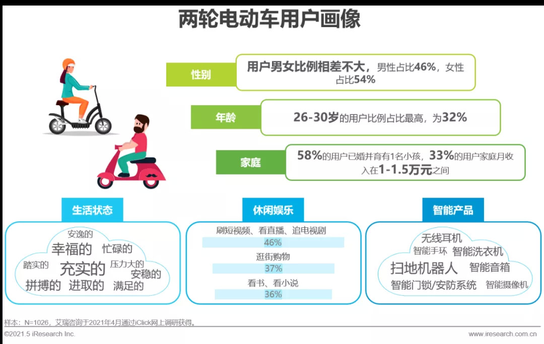 两轮电动车用户男女比例相差不大,26-35岁年龄段用户占比最高,58%的用户已婚育有1名小孩;充实、幸福、进取、拼搏是生活的主旋律。大部分用户爱好刷短视频/看直播/追电视剧、逛街购物、看书/看小说;大部分用户对扫地机器人、智能洗衣机、智能音箱、无线耳机、智能门锁/安防系统等智能化产品兴趣程度高。