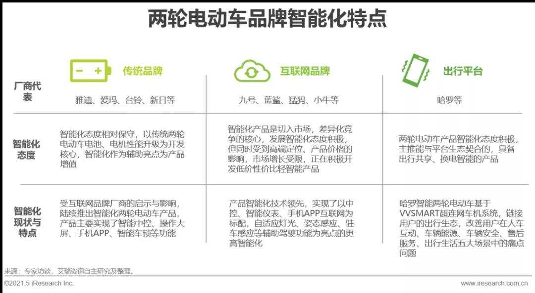 两轮电动车智能化依旧处于发展的早期阶段,在整车环节上,智能化两轮电动车厂商有三种类型:以雅迪、爱玛、台铃等为代表的传统两轮电动车厂商,以小牛、九号、蓝鲨等为代表的互联网品牌电动车厂商,以及以哈罗为代表的出行平台。整体而言,传统两轮电动车品牌的产品开发重心依旧是提升产品性能,智能化作为产品亮点辅助增值。互联网品牌以打造智能化两轮电动车产品为主,其在新技术与传统工艺融合上具备优势,但产品研发成本较高,价格昂贵。出行平台在出行生态与场景互通上更加具备优势,在两轮电动车的生产制造、供应链环节缺乏经验,在真正实现大规模共享电动两轮出行、车电分离前,产品优势不明显。