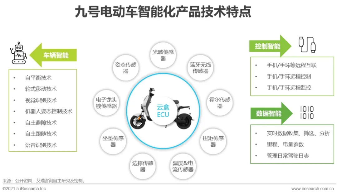 九号公司是一家专注于智能短交通和服务类机器人领域的创新企业,旗下产品包含平衡车、滑板车、机器人、全地形等产品。九号智能两轮电动车通过云盒ECU以及多个传感器的使用,使两轮电动车在多方面实现“真智能”。电子车锁等减少用户上下车环节繁复的插拔钥匙、收放边撑等操作,乘坐传感器避免用户未上车启动,姿态传感器监测车辆异常状态并提醒,温度&电流传感器辅助电池BMS系统更好的管理与保护充放电等。同时,基于GPS/北斗/基站精准定位、车联网系统等实现方便用户随时查看车辆相关信息、远程监测、远程控制与远程人机交互等,提升用户体验和用户出行的安全性。