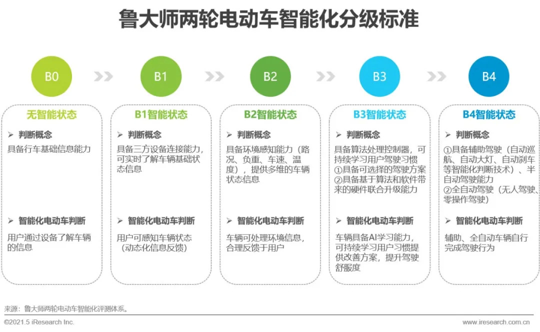 随着两轮电动车锂电渗透率的提升,智能化将成为电动两轮车的标准配置,而两轮电动车品牌繁多,车型价格差距大,各类专业的营销名词给消费者选车、购车带来极大认知困难和购车的不确定性。为此,鲁大师独创智能化评测评级,在鲁大师实验室测试环境下,将电动两轮车评测从B0-B4进行分级。B是brain power以及bicycle的第一个字母,作为这个行业的分级字符。
