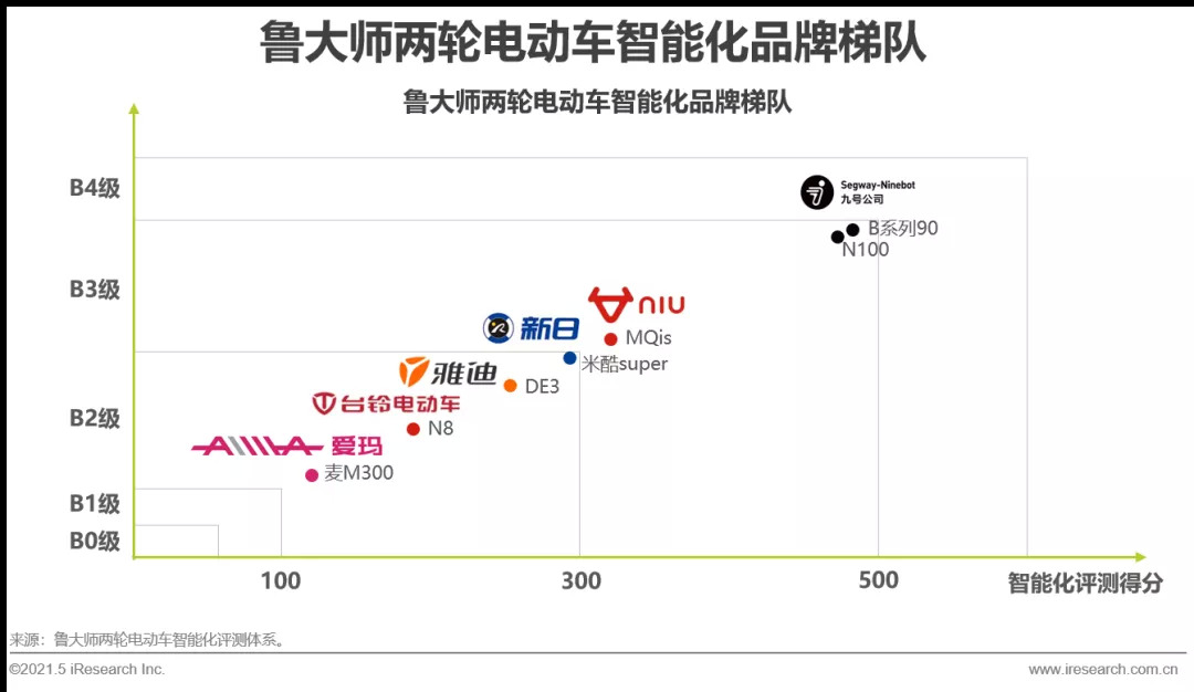 根据鲁大师的两轮电动车智能化评分标准,目前主流的两轮电动车品牌产品智能化水平集中在B2级,如:新日米酷super、雅迪DE3、台铃N8、爱玛麦300等。产品达到智能化B3级的两轮电动车品牌只有九号公司和小牛,其中九号公司旗下的电动车产品智能化水平最高,B系列90、N100两款电动车的智能化评分均明显高于其他品牌。