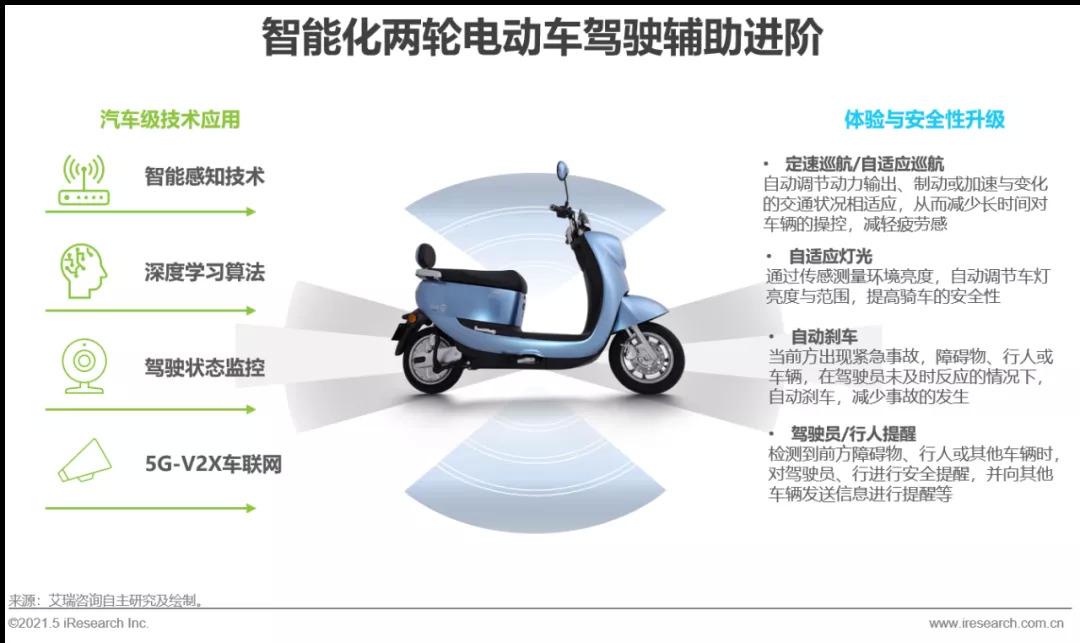 汽车的智能化发展路径为两轮电动车智能化提供了重要的参考意义,自动驾驶为汽车消费者带来极佳的驾车体验提升与驾驶安全性提升。同理,随着更多汽车级V2X车联网、辅助驾驶、人工智能等技术在两轮电动车上被迁移应用,两轮电动车智能化等级将得到全面升级与优化。