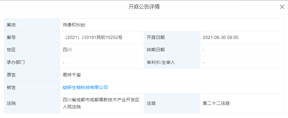 天眼查App显示,易烊千玺与绽妍生物科技有限公司肖像权纠纷案将于2021年6月30日开庭,案号为(2021)川0191民初10252号,经办法院为四川省成都市成都高新技术产业开发区人民法院。