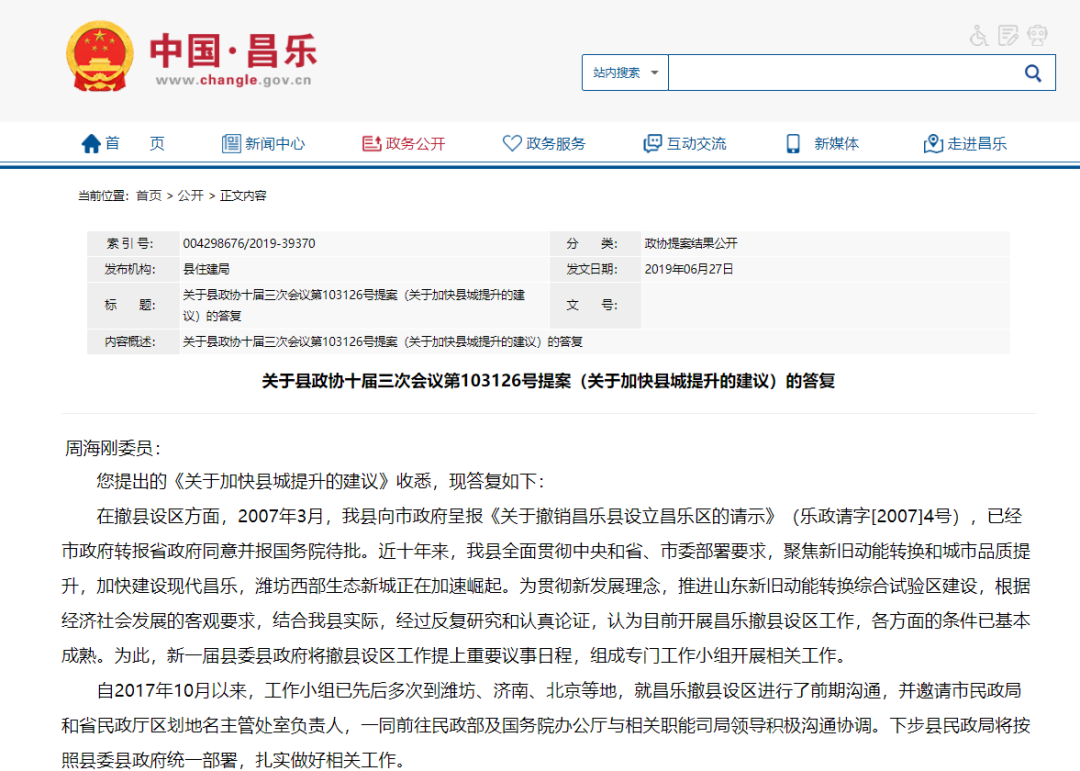 早在2019年6月,昌乐县政府官网发布公告称,在撤县设区方面,2007年3月,昌乐县向市政府呈报《关于撤销昌乐县设立昌乐区的请示》,已经市政府转报省政府同意并报国务院待批。