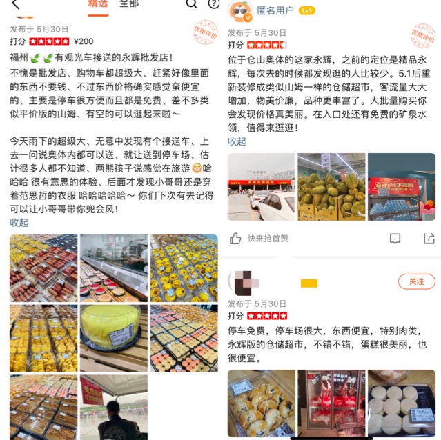 大众点评的评价和图片显示,这家店位于福州体育场馆集群的奥体中心,停车位充足,整个卖场约1万平方米,商品陈列初步具备仓储超市的特点,部分农产品和生鲜产品也以散装堆头陈列。