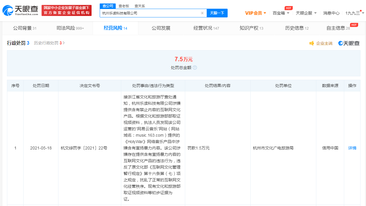 据天眼查APP显示,近日,杭州乐读科技有限公司新增一则行政处罚,决定文书号杭文综罚字〔2021〕22号,处罚单位为杭州市文化广电旅游局,处罚事由为该公司运营的“网易云音乐”网站提供的网络音乐产品中涉嫌含有宣扬暴力内容,处罚结果为罚款1.5万元。