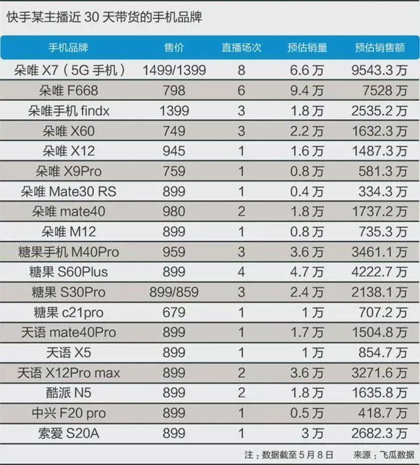 以朵唯为例,快手统计数据显示,朵唯手机最近成为手机品牌周榜的冠军,单周销售额超过9000万,将苹果、华为、小米等品牌甩在身后。在一个月的时间内,朵唯品牌的各款手机的200多场带货直播中,累计销售额逼近3亿。
