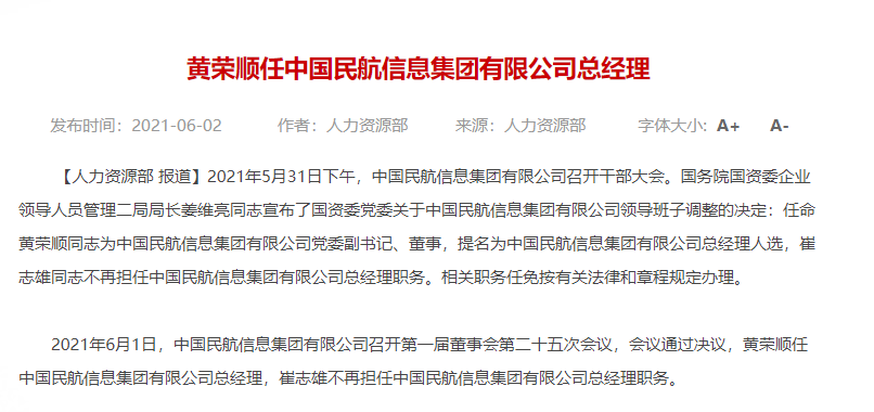 中国航信集团6月2日在官网披露,2021年5月31日下午,中国民航信息集团有限公司召开干部大会。国务院国资委企业领导人员管理二局局长姜维亮同志宣布了国资委党委关于中国民航信息集团有限公司领导班子调整的决定:任命黄荣顺同志为中国民航信息集团有限公司党委副书记、董事,提名为中国民航信息集团有限公司总经理人选,崔志雄同志不再担任中国民航信息集团有限公司总经理职务。相关职务任免按有关法律和章程规定办理。