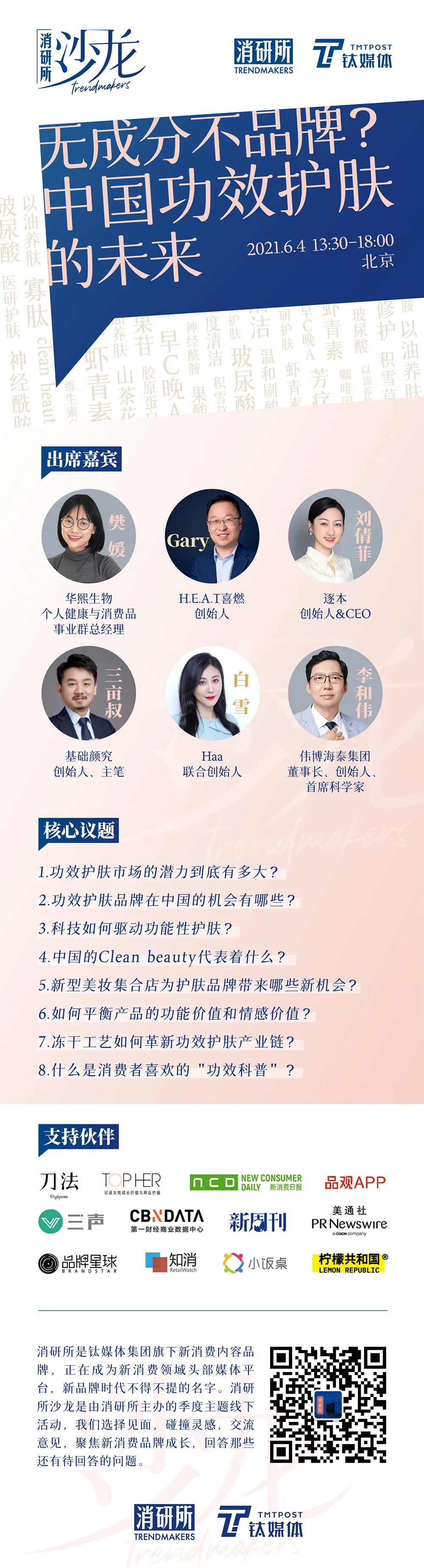 此次沙龙6月期邀请到功能护肤领域全链条核心玩家,从技术到工艺,从原料到品牌,从平台到零售,全面梳理功效护肤中国品牌的发展路径,探寻中国功能护肤的未来延展空间。