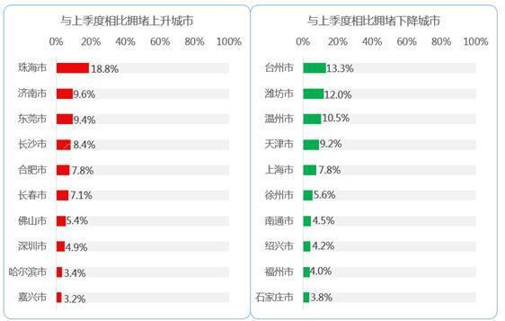 而在整个一季度当中,济南的高峰拥堵延时指数上升了9.6%。延时指数增幅最大的珠海,指数上升18.8%,主要是由于其一季度降雨天数同比增多一倍。