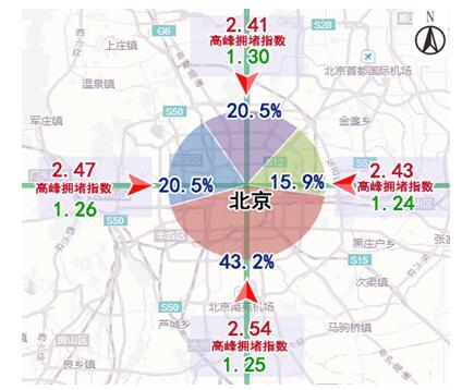 而北京是典型的职住失衡城市。通过城市的潮汐式道路分布,可以衡量一座城市是否职住失衡,而潮汐式道路是指早晚高峰时段,一侧交通流量大、反向流量小的道路。北京的潮汐式道路最多达到88条,而且早高峰潮汐式道路多于晚高峰。“这应该与晚上出行目的较分散有关。”房一多表示。北京南向北方向的高峰拥堵延时指数最高达2.54,而反方向只有1.25,差距最为明显。