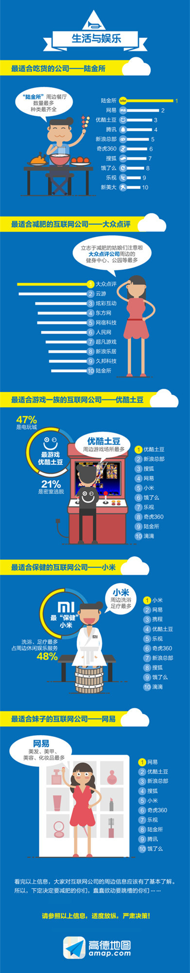同时高德还发布了一份与中国互联网公司相关的排行榜,统计显示:上班最“堵”的互联网公司是奇虎360,位于酒仙桥路、望京街等路段附近;互联网公司周边最拥堵的一条道路是百度公司附近的西二旗大街;周围保健服务最多的公司是小米;员工最喜欢住在公司附近的企业,以及附近美容、美甲、化妆品店最多的公司是网易;周边美食最多公司为陆金所;周边健身房最多的公司是大众点评。