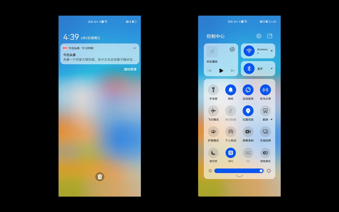 除了服务卡片的运用,HarmonyOS 2还改变了通知控制中心的交互逻辑。在以往的系统中,二者是被集成到了一起。