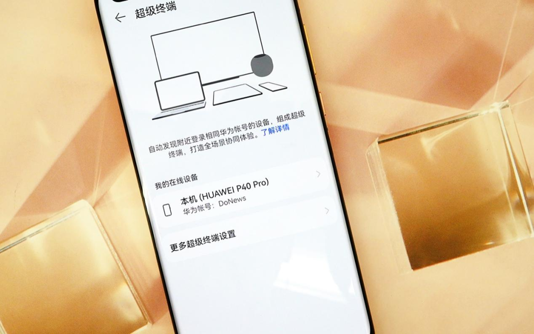 播控中心可以一键切换音乐APP和播放音源,还可以控制周边音频设备的播放。而超级终端模块对于HarmonyOS而言就显得格外重要了,它是连接华为IoT设备的重要窗口,只要周围设备登录了相同的华为账号,只需点击其中一个设备图标,即意味着连接成功,从而可以更便捷的操控智能家居。