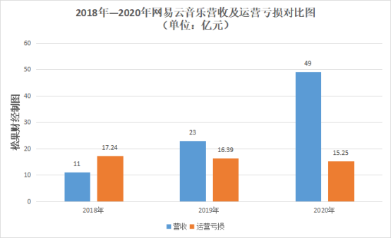 成立八年来,网易云音乐尚未盈利。目前营收虽连年增长,但亏损还是居高不下。招股书数据,2018年—2020年,网易云音乐营收分别为11亿元、23亿元及49亿元,分别同比增长101.9%、111.2%。同期,运营亏损分别为17.24亿元、16.39亿元及15.25亿元。