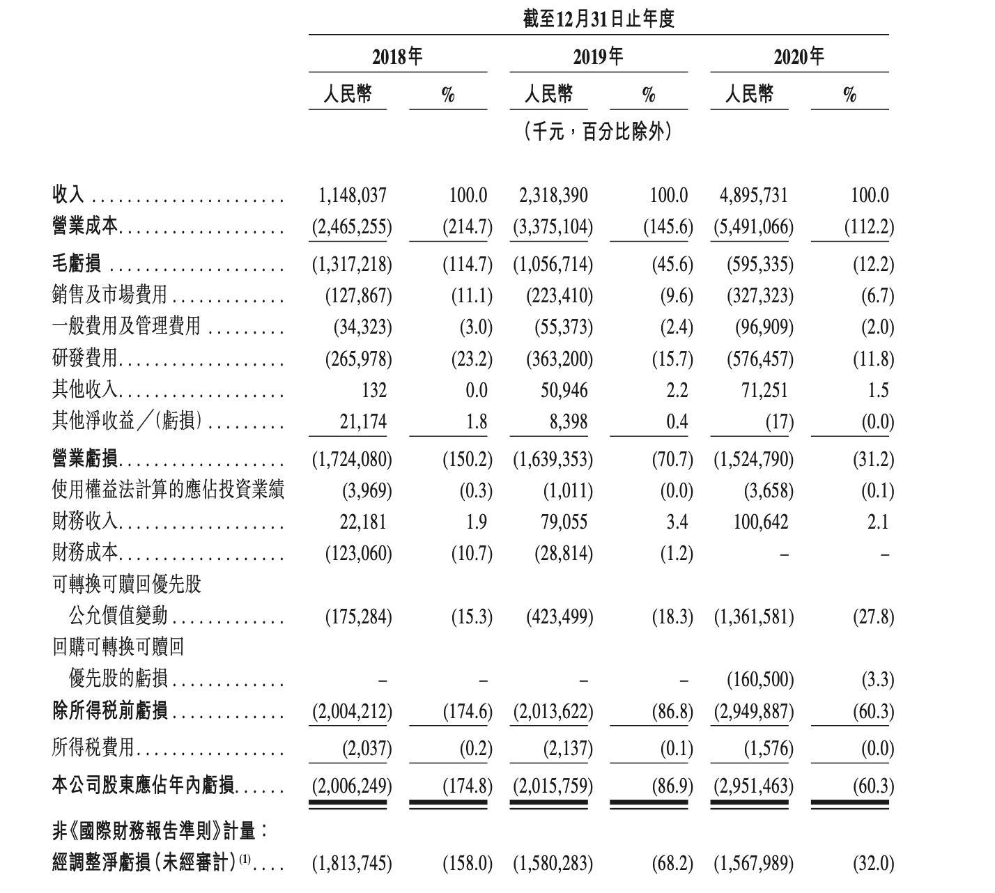 毛亏损率分别为114.7%、45.6%、12.2%。毛亏率大幅收窄从2018年的人民币11亿元增至2019年的人民币23亿元,并进一步增至2020年的人民币49亿元。