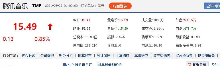 美东时间5月27日,腾讯音乐收报15.49美元/股,总市值262亿美元。