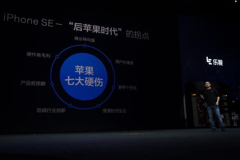 在发布会上,贾跃亭又一次拿出了“苹果衰落论”,认为iPhoneSE七大硬伤:商业导向强,硬件毛利高,产品预期低,阻碍行业创新,用户价值差,剥夺个性化,傲慢封闭生态。同时祭出打破苹果垄断的大旗,吹响民族品牌崛起的号角,消灭硬件毛利,推出了乐2、乐2 Pro和乐Max 2,“给苹果有力的第二击。”