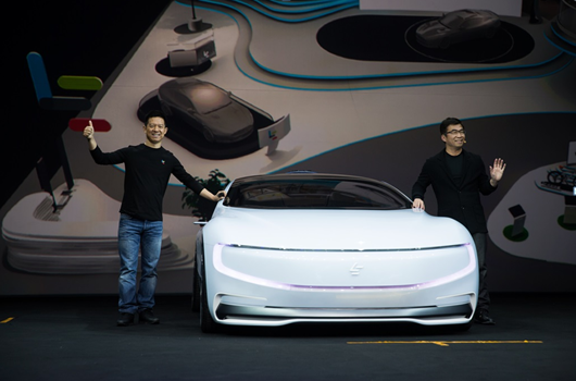 贾跃亭在不断强调新能源汽车对环保的贡献,对治理空气污染的意义,以及外观设计的美。