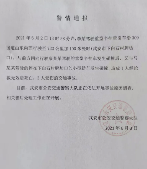 “武安公安”微信公众号6月3日通报,6月2日13时58分许,李某驾驶重型半挂牵引车沿309国道由东向西行驶至723公里加100米处时(武安市下白石村牌坊口),与前方同向行驶康某某驾驶的重型半挂车发生碰撞后,又与马某某驾驶的停在下白石村牌坊口的小型轿车发生碰撞,造成1人经抢救无效后死亡,3人受伤的交通事故。