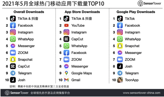 “SensorTower”微信公众号6月3日消息,Sensor Tower商店情报数据显示,2021年5月抖音及其海外版TikTok以超过8000万下载量,蝉联全球移动应用(非游戏)下载榜冠军。其中,抖音的下载量占12%,TikTok巴西市场的下载量占比为16%。注:下载量仅统计App Store和Google Play,不包括中国及其它地区第三方安卓市场。