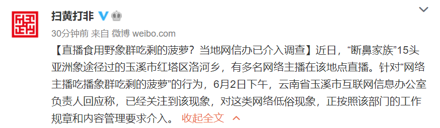 据@扫黄打非 微博消息,近日,“断鼻家族”15头亚洲象途经的玉溪市红塔区洛河乡,有多名网络主播在该地点直播。针对“网络主播吃播象群吃剩的菠萝”的行为,6月2日下午,云南省玉溪市互联网信息办公室负责人回应称,已经关注到该现象,对这类网络低俗现象,正按照该部门的工作规章和内容管理要求介入。