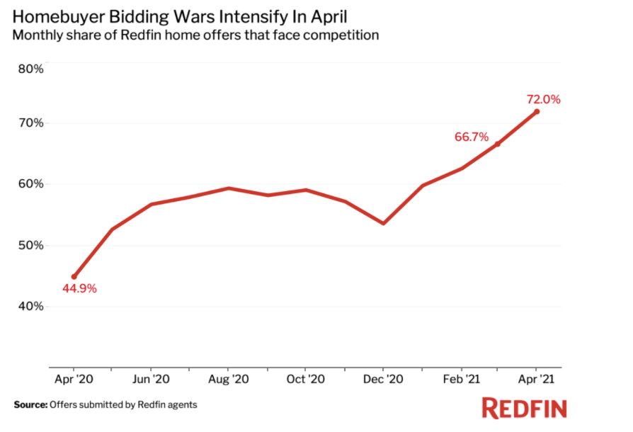房地产网站Redfin的最新数据显示,代理的房屋中,有四分之三在4月面临激烈竞价,高出去年同期的44.9%,这也是连续第12个月有超过一半的房源遭遇竞价。