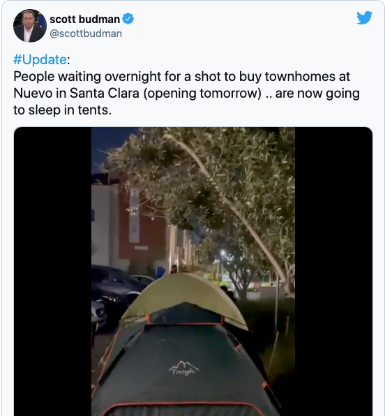 美国NBC记者记录了Nuevo开盘前买家连夜扎帐篷排队的景象
